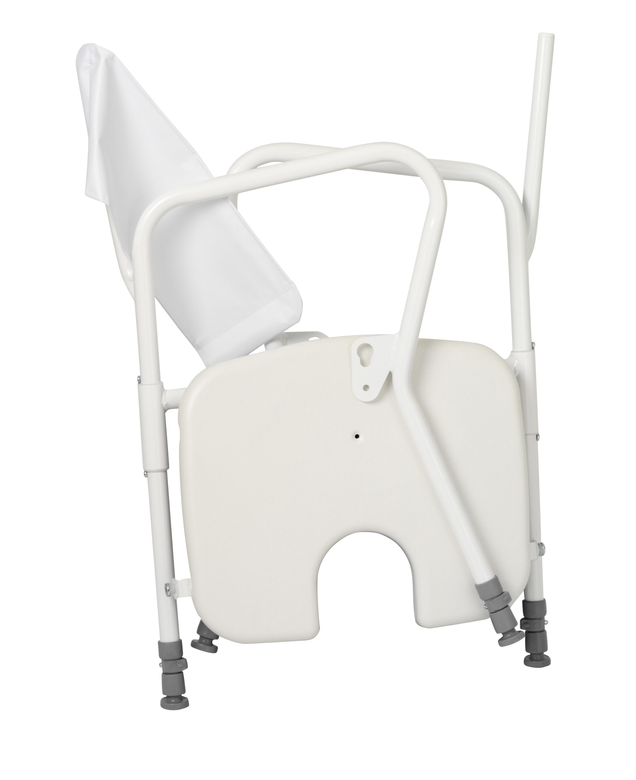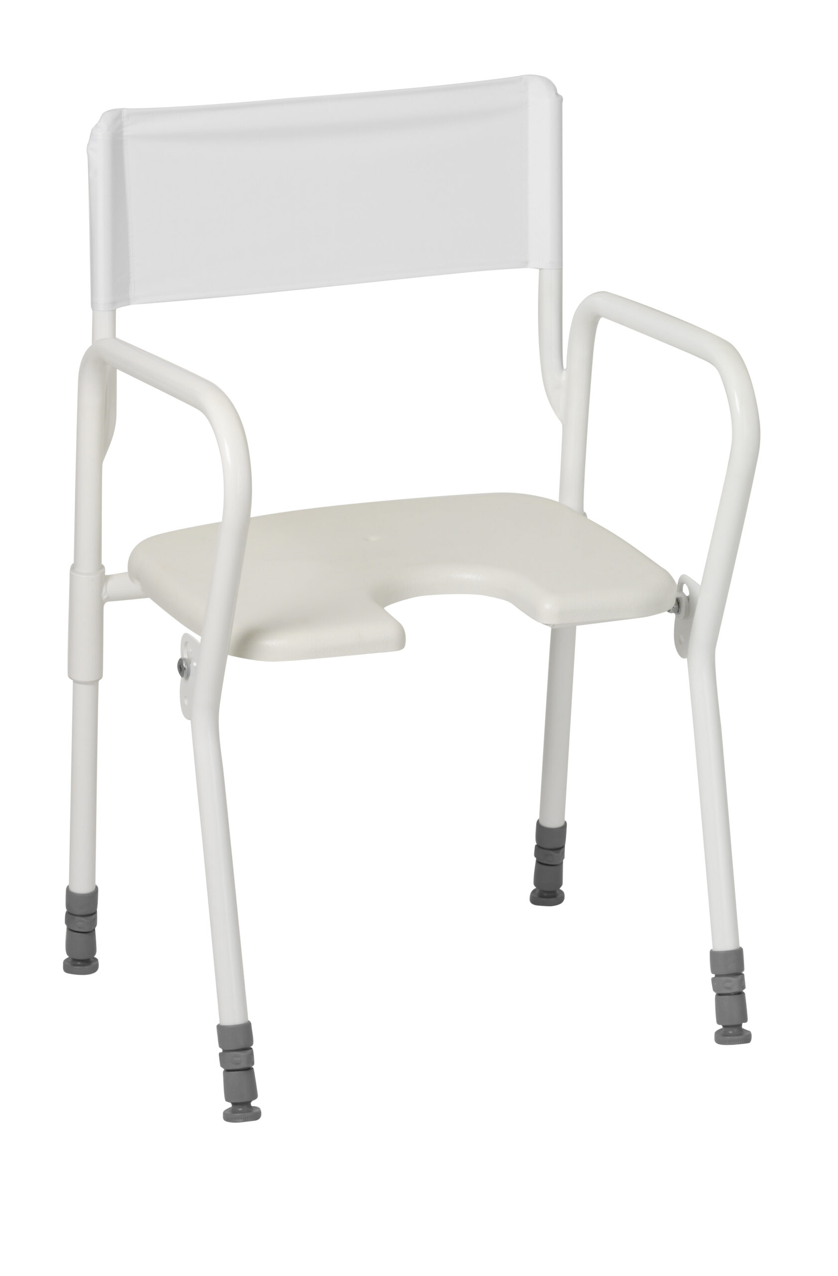 Sammenleggbar dusjstol med rustbeskyttet stålramme, myk rygg og sete med dreneringshull og hygienisk utsparing. Sklisikre gummiføtter.
