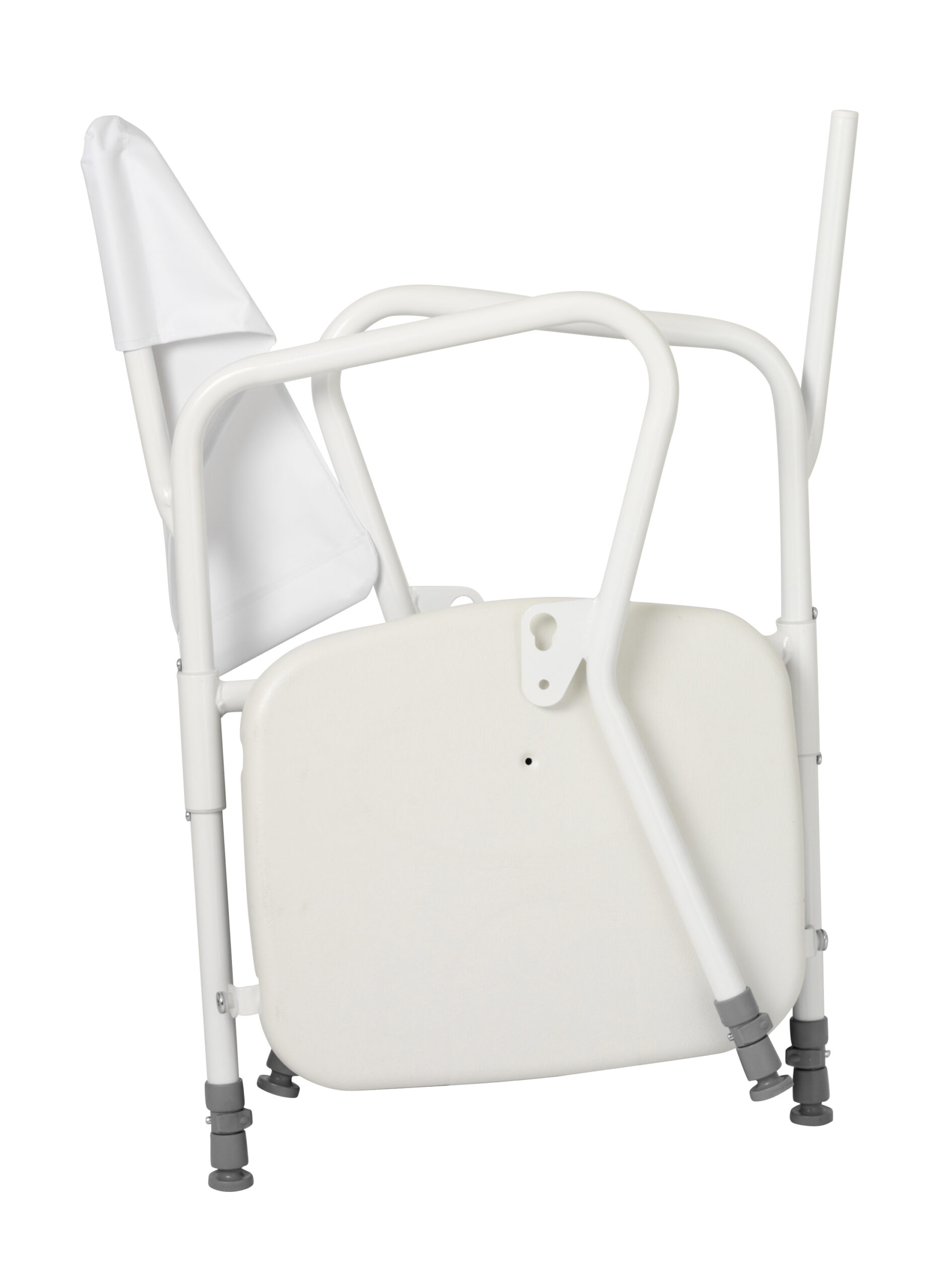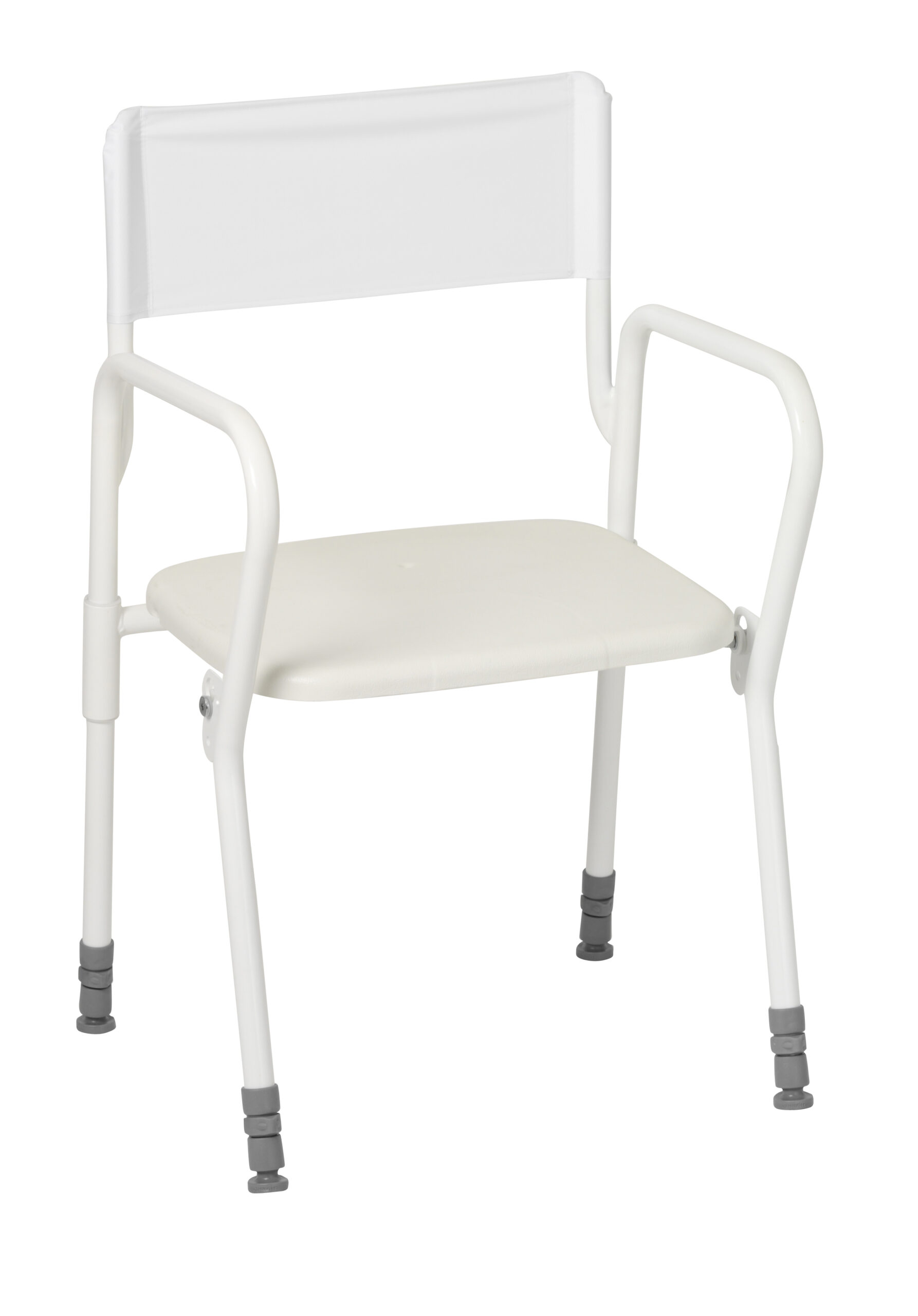 Stabil, sammenleggbar dusjstol med rustbeskyttet stålramme, myk ryggstøtte og sete med dreneringshull. Sklisikre gummiføtter.
