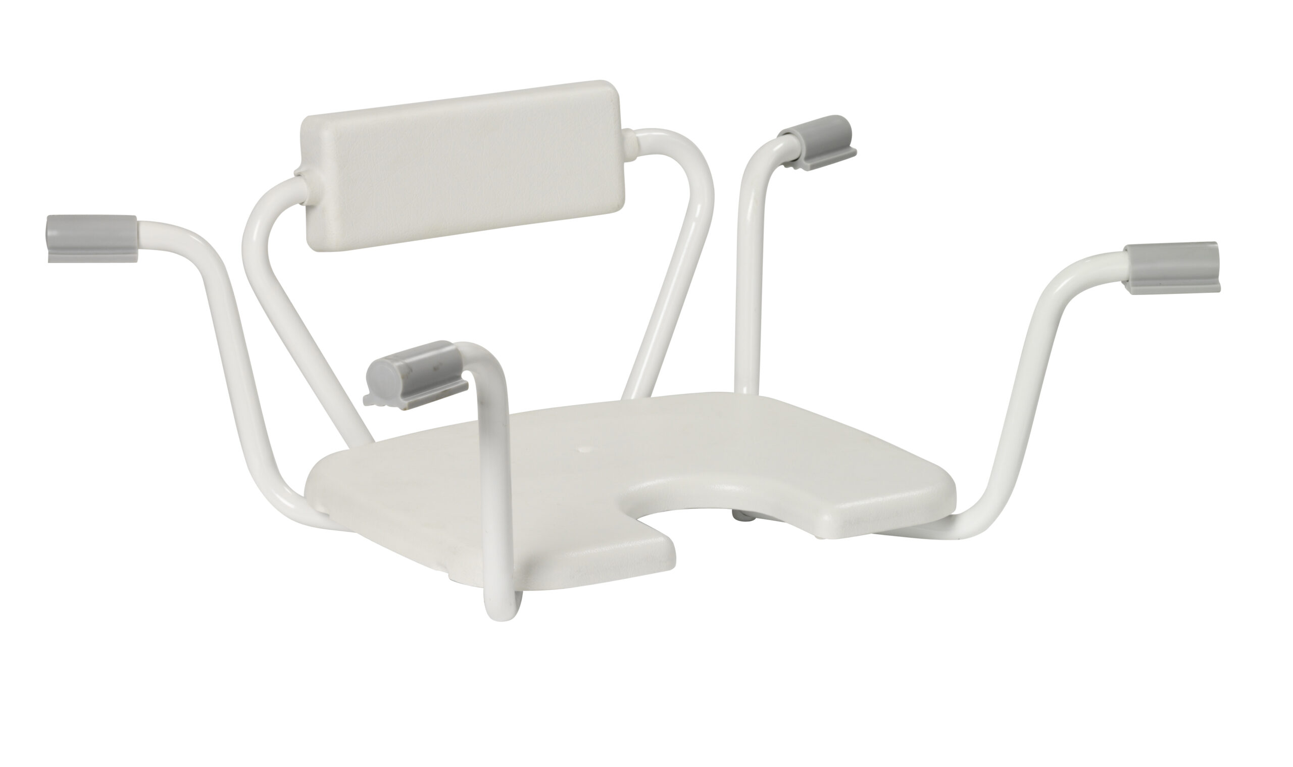 Opphengssete med hygienisk utsparing og drenering. Verktøyfri klemmontering, sikkerhetsmuttere anbefales >90 kg. Sklisikre elementer beskytter emaljen.